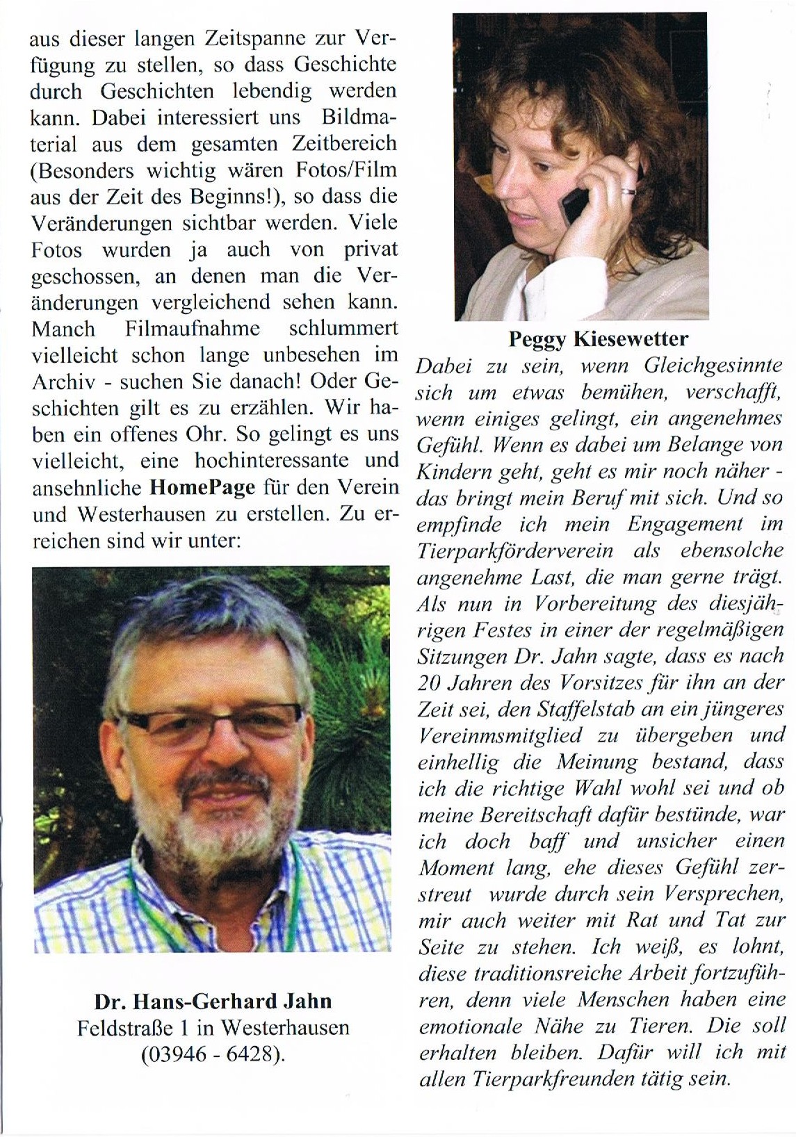 An dieser Stelle möchten wir darauf hin-weisen, dass im Zuge der Kreisgebietsreform der Tierpark aus der Verantwortlichkeit der Kernstadt Thale vollständig in die Hände des Tierparkfördervereins gelegt wurde. Da nun diese "gänzliche Verantwortlichkeit" auch ein Höchstmaß an Kenntnis über kommunale und andere gesetzliche Belange verlangt, erklärte sich der Ortsteilbürgermeister von Westerhausen, Herr Eberhard Heintze, dazu bereit, diese wichtige Führungsaufgabe zu übernehmen, nachdem er schon bisher als Mitglied des Fördervereins sehr aktiv für die Belange des Tierparks tätig war. Deshalb lautet die Kontaktadresse des Vereins nun: